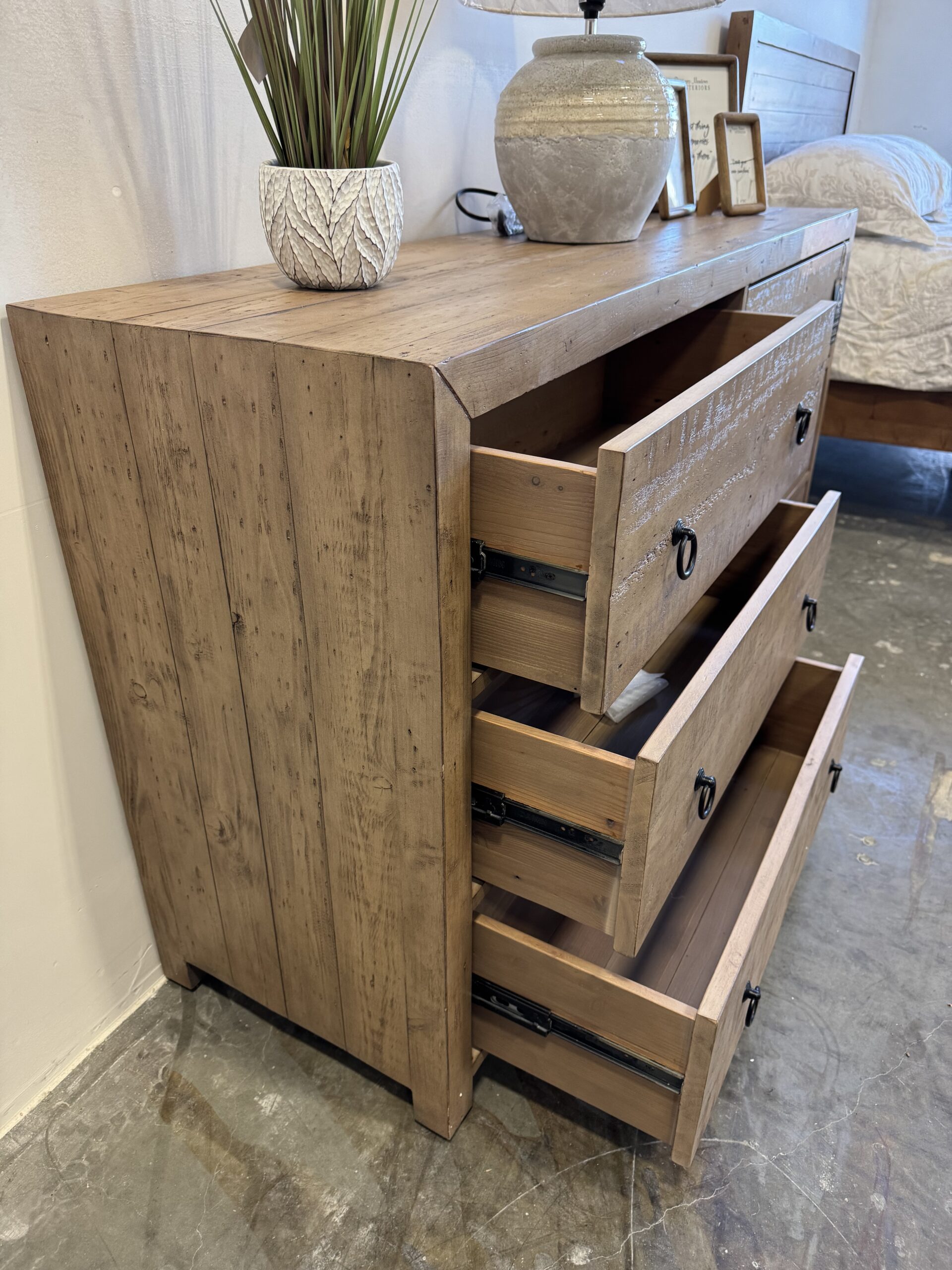 In a light rustic cinnamon finish. Full extension drawer glides