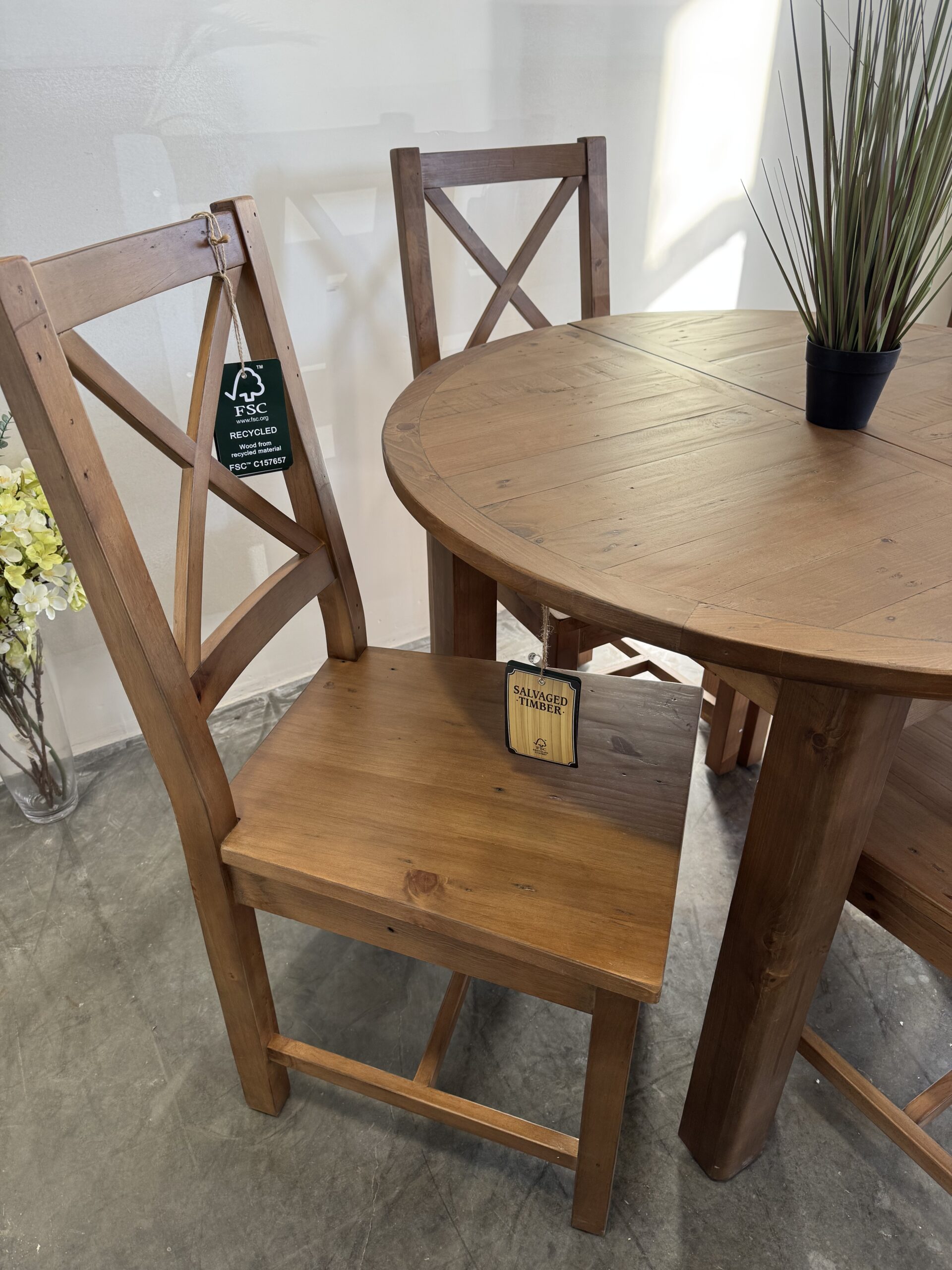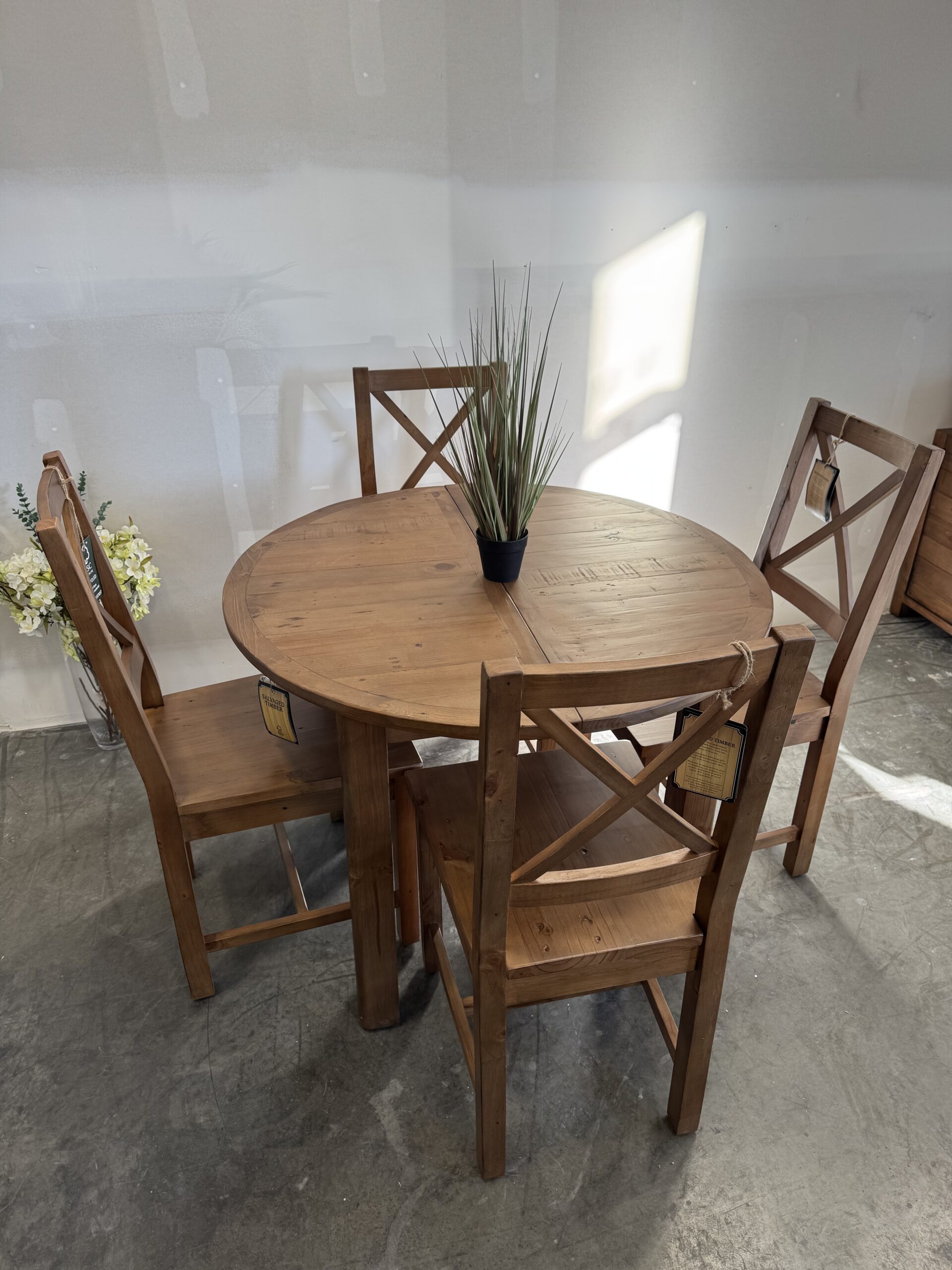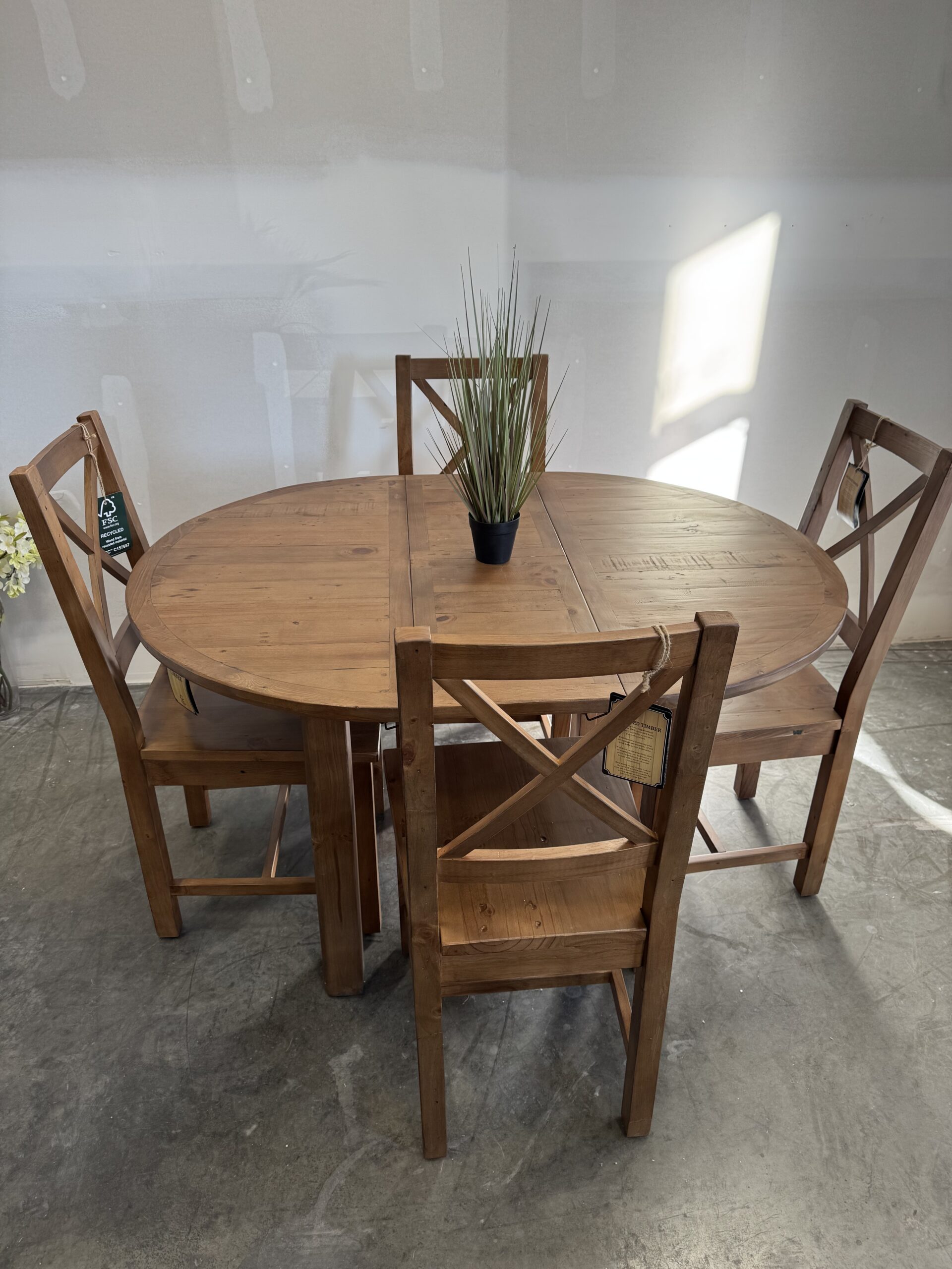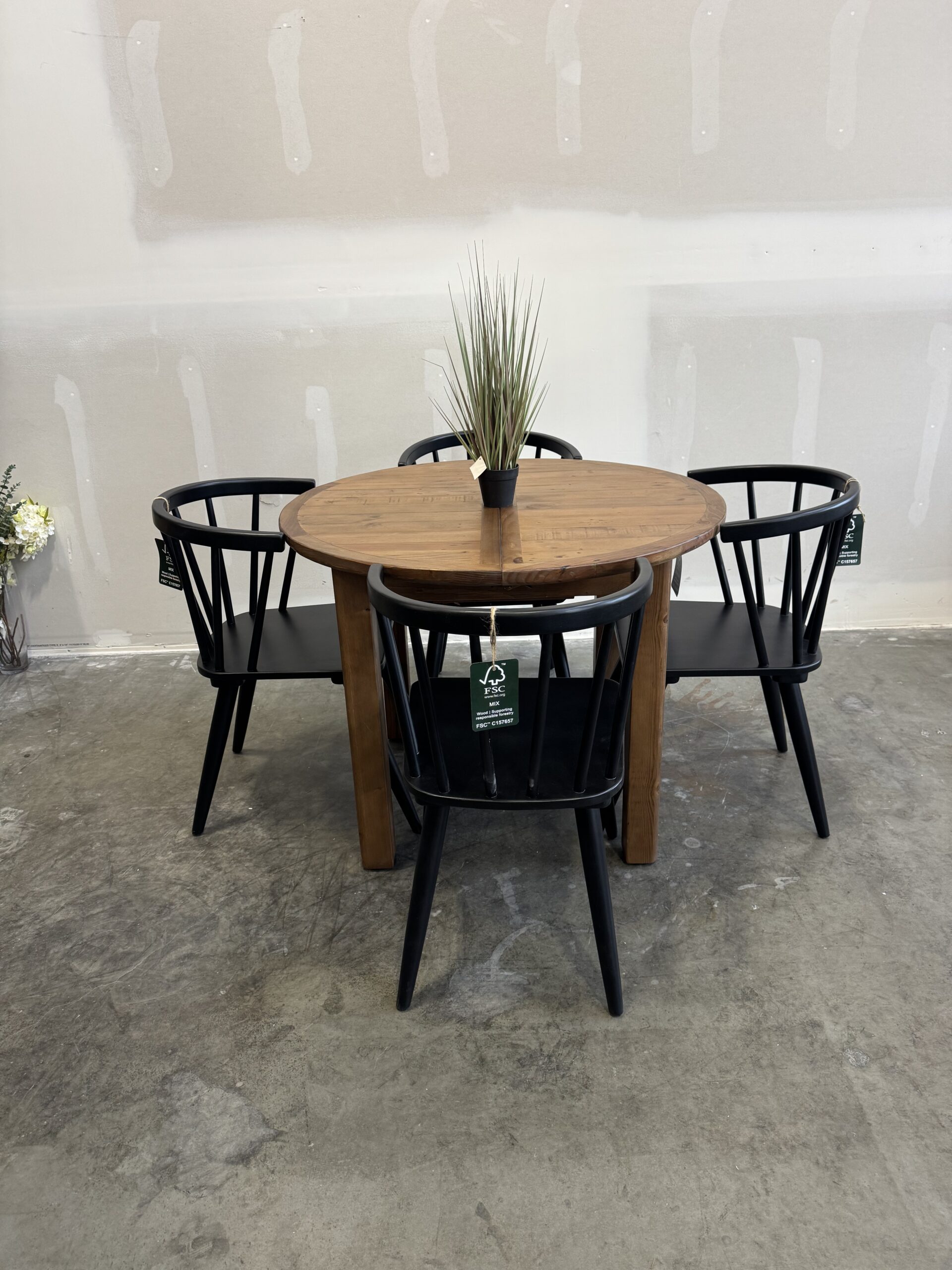Set comprises of 1 x table and 4 x Flea Market chairs with padded seat – in cashew