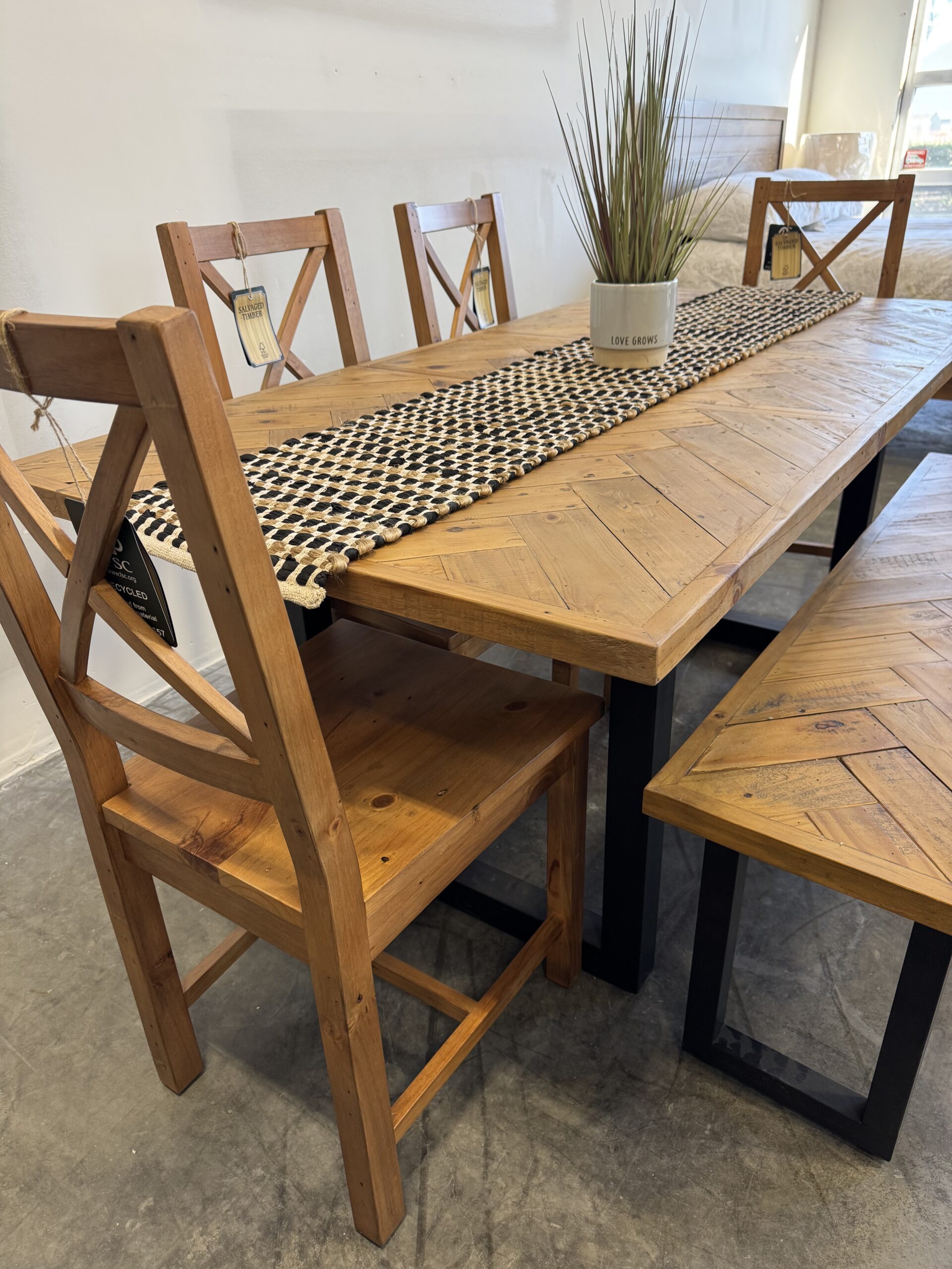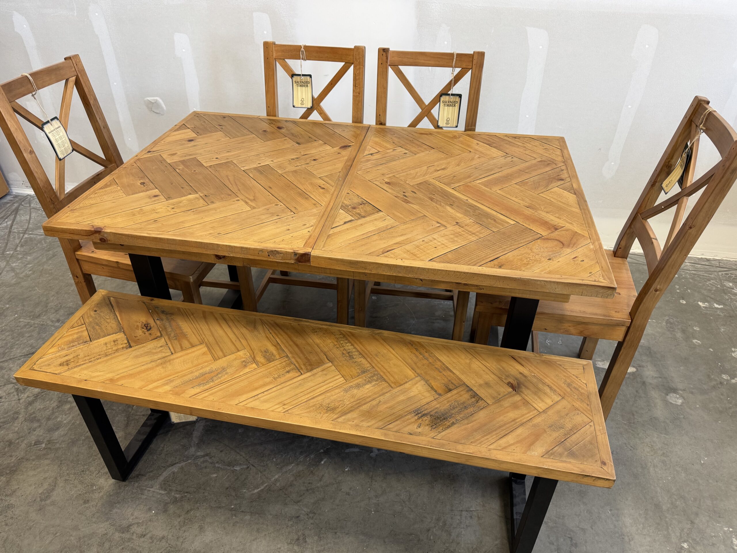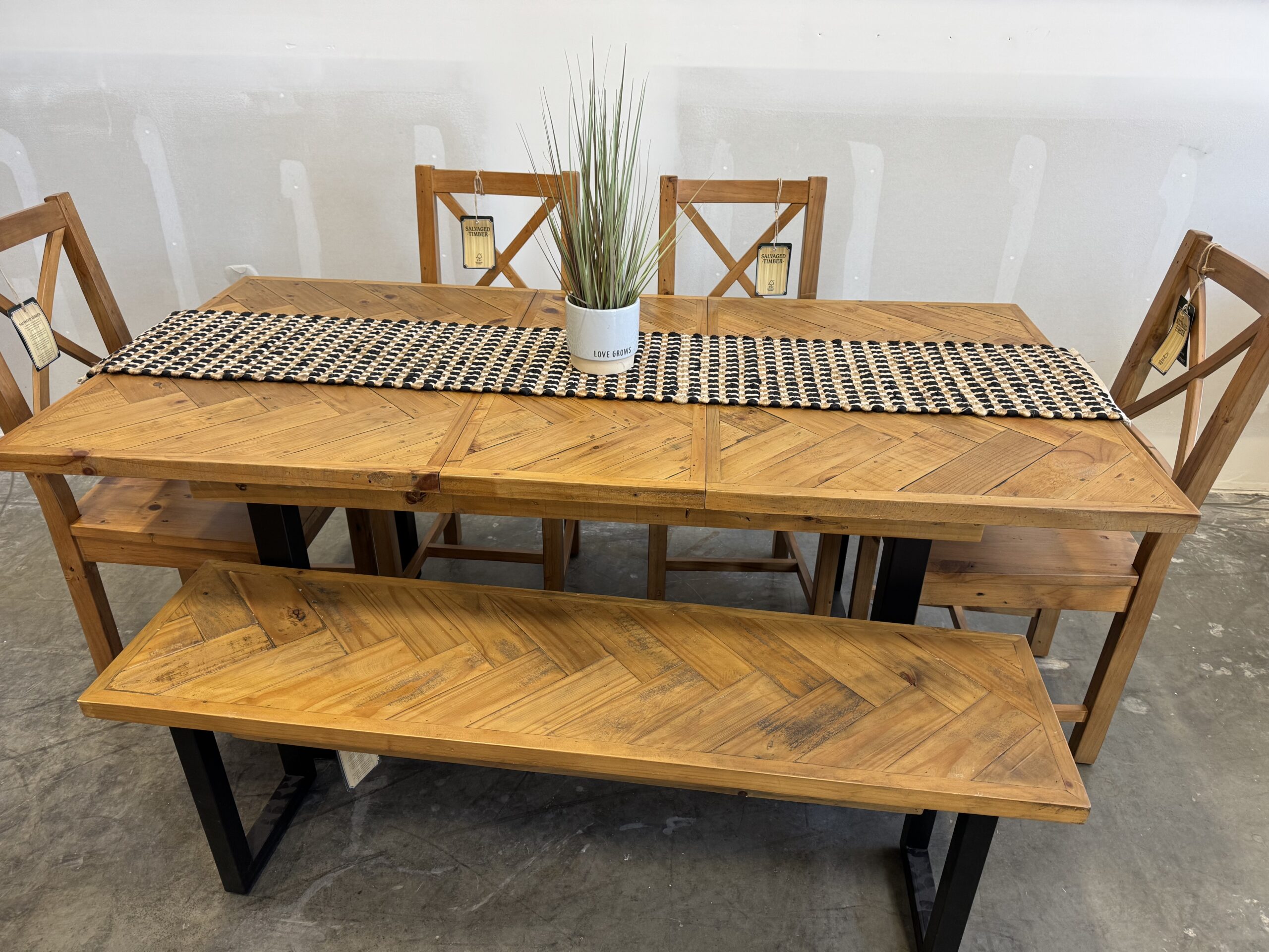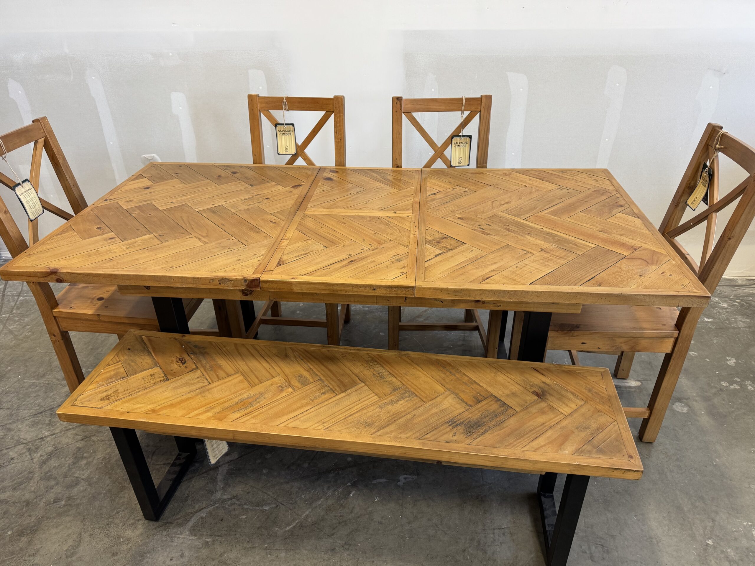 Set comes with 4 x chairs (choice of styles) and 1 x bench